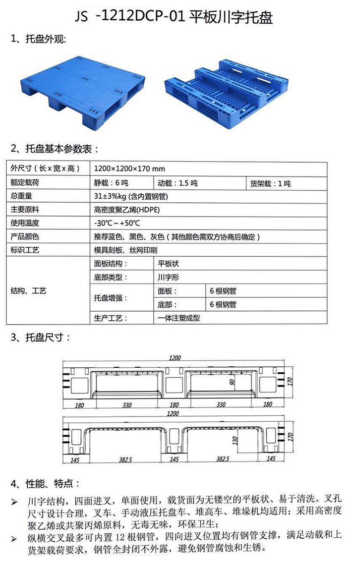 3、塑料托盤的適應(yīng)環(huán)境溫度:-25℃-80℃(盡量避免陽光爆曬及靠近熱源)。